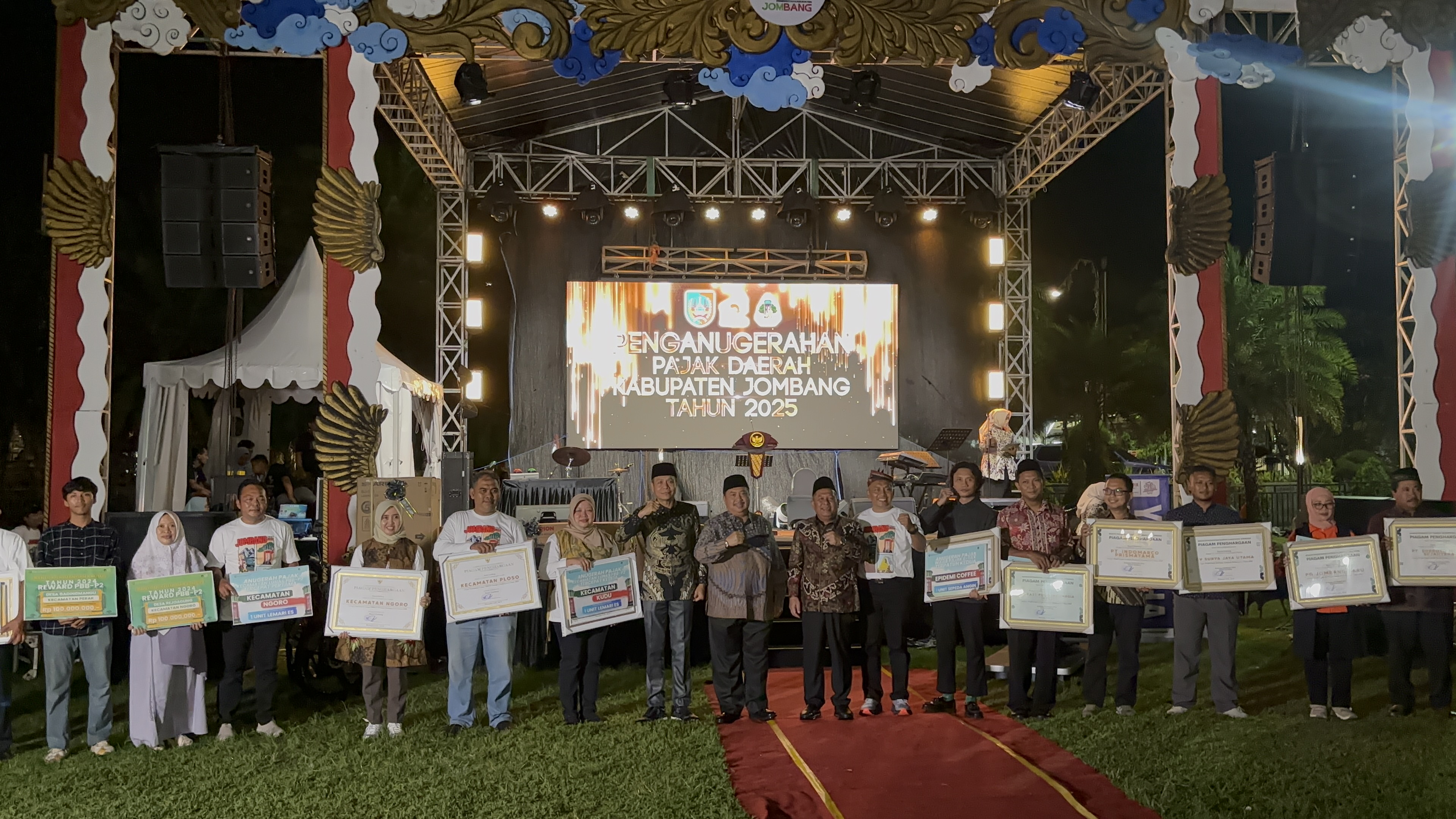 Jombang, Bapenda – Pemerintah Kabupaten (Pemkab) Jombang memberikan apresiasi tertinggi kepada para wajib pajak, perangkat daerah, camat, dan kepala desa yang telah berkontribusi aktif dalam optimalisasi pendapatan daerah. Penghargaan ini dikemas dalam acara "Malam Anugerah Pajak Daerah Tahun 2025" yang digelar di Alun-Alun Kabupaten Jombang, Sabtu (25/10/2025).